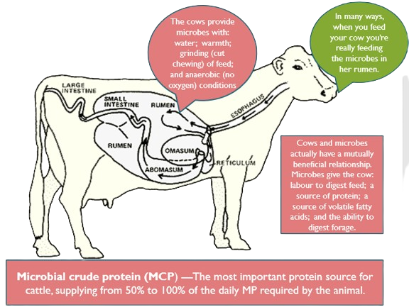 - Adequate protein level (> 7% CP) in the diet is required for maximal growth and activity of ruminal microorganisms, thus producing desired MCP amounts and maximizing ruminal fermentation.